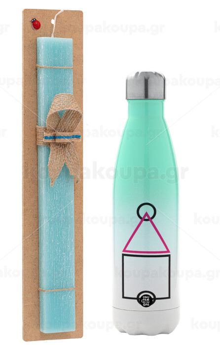 The squid game ojingeo, Easter Set, Metallic green/white thermos (Stainless steel), double-walled, 500ml & scented flat Easter candle (30cm) (TURQUOISE)