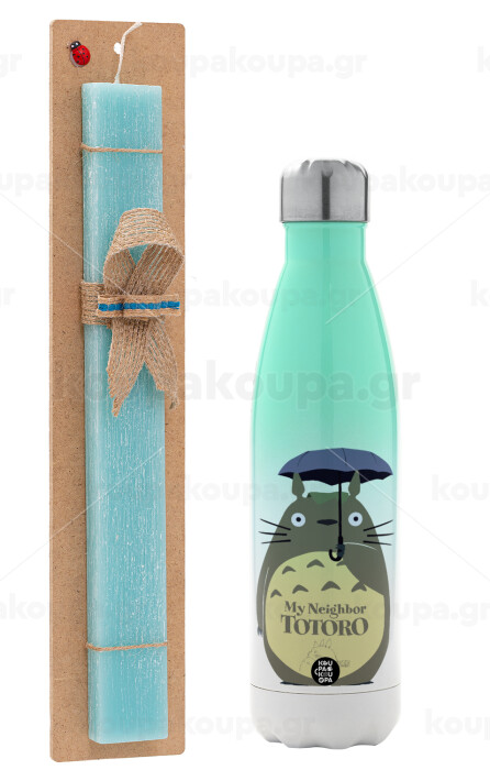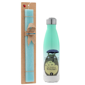 Totoro from My Neighbor Totoro, Easter Set, Metallic green/white thermos (Stainless steel), double-walled, 500ml & scented flat Easter candle (30cm) (TURQUOISE)