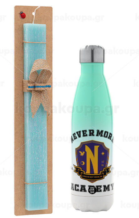 Wednesday Nevermore Academy University, Easter Set, Metallic green/white thermos (Stainless steel), double-walled, 500ml & scented flat Easter candle (30cm) (TURQUOISE)
