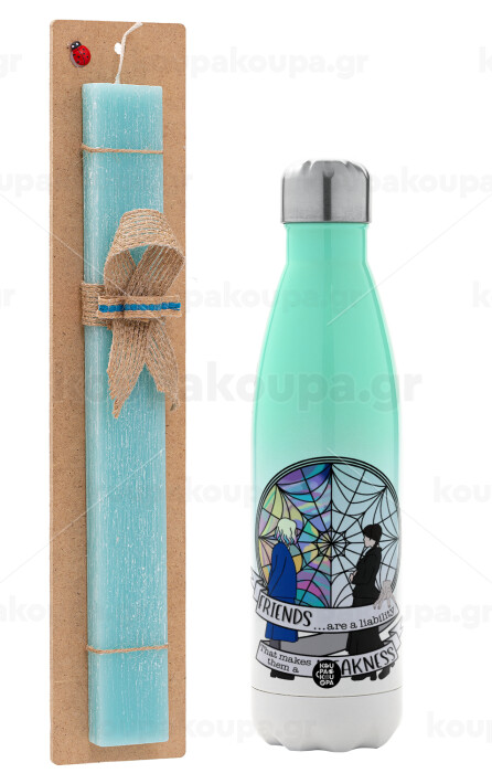 Wednesday window, Easter Set, Metallic green/white thermos (Stainless steel), double-walled, 500ml & scented flat Easter candle (30cm) (TURQUOISE)