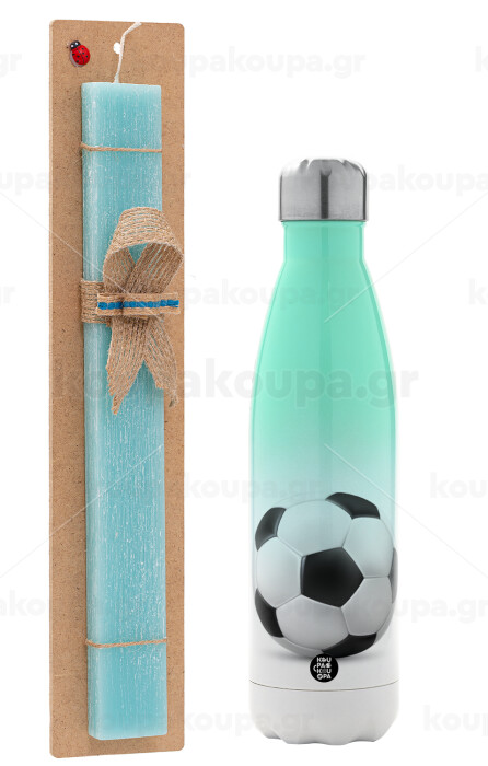 Soccer ball, Easter Set, Metallic green/white thermos (Stainless steel), double-walled, 500ml & scented flat Easter candle (30cm) (TURQUOISE)