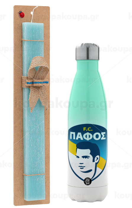 Πάφος FC, Easter Set, Metallic green/white thermos (Stainless steel), double-walled, 500ml & scented flat Easter candle (30cm) (TURQUOISE)