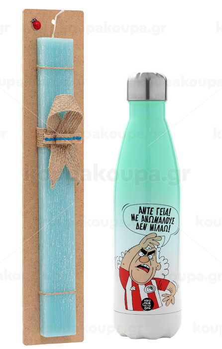 Τάκης, Άντε γεια, με ανώμαλους δεν μιλάω!, Easter Set, Metallic green/white thermos (Stainless steel), double-walled, 500ml & scented flat Easter candle (30cm) (TURQUOISE)
