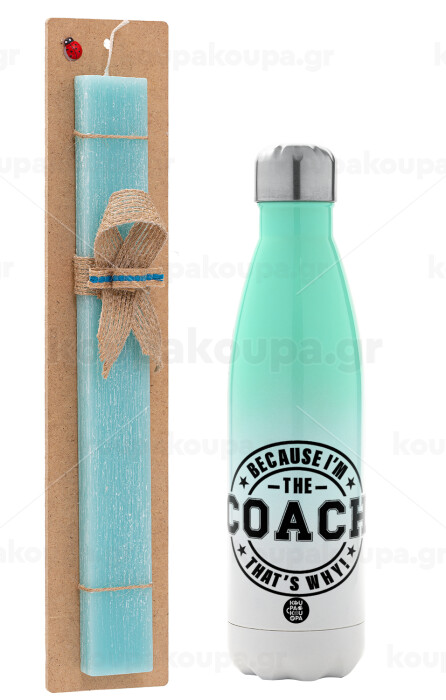 Because i'm the Coach, Easter Set, Metallic green/white thermos (Stainless steel), double-walled, 500ml & scented flat Easter candle (30cm) (TURQUOISE)