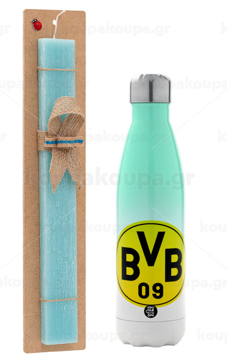 BVB Dortmund, Easter Set, Metallic green/white thermos (Stainless steel), double-walled, 500ml & scented flat Easter candle (30cm) (TURQUOISE)