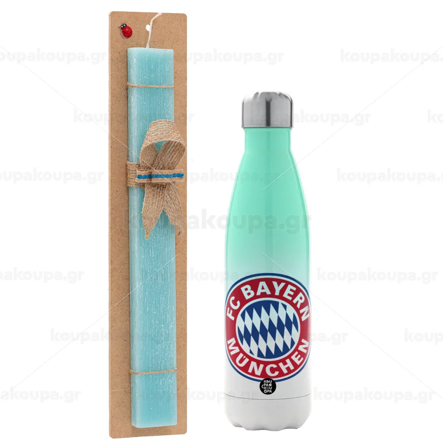 FC Bayern Munich, Easter Set, Metallic green/white thermos (Stainless steel), double-walled, 500ml & scented flat Easter candle (30cm) (TURQUOISE)