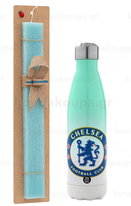 FC Chelsea, Easter Set, Metallic green/white thermos (Stainless steel), double-walled, 500ml & scented flat Easter candle (30cm) (TURQUOISE)