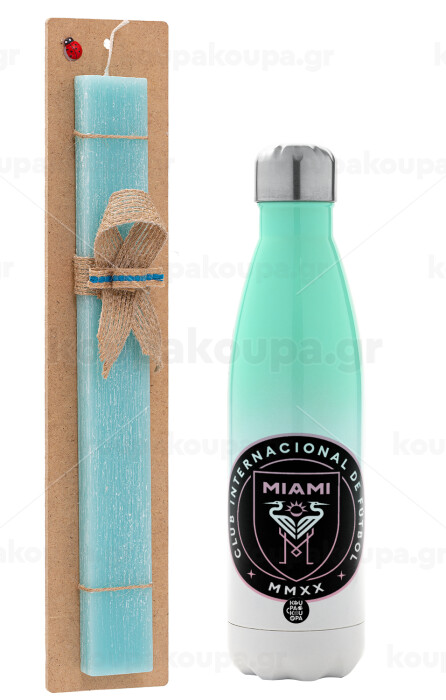 Inter Miami CF, Easter Set, Metallic green/white thermos (Stainless steel), double-walled, 500ml & scented flat Easter candle (30cm) (TURQUOISE)