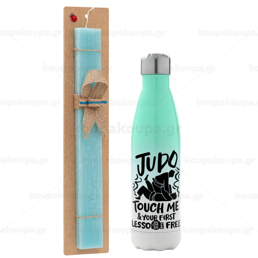 Judo Touch Me And Your First Lesson Is Free, Easter Set, Metallic green/white thermos (Stainless steel), double-walled, 500ml & scented flat Easter candle (30cm) (TURQUOISE)