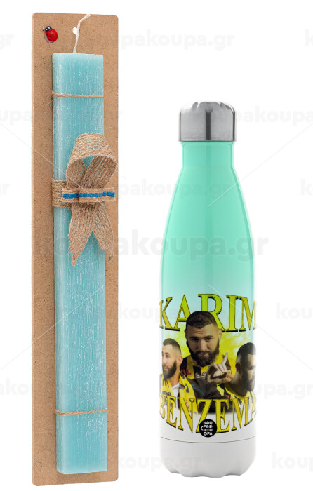 Karim Benzema, Easter Set, Metallic green/white thermos (Stainless steel), double-walled, 500ml & scented flat Easter candle (30cm) (TURQUOISE)