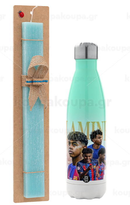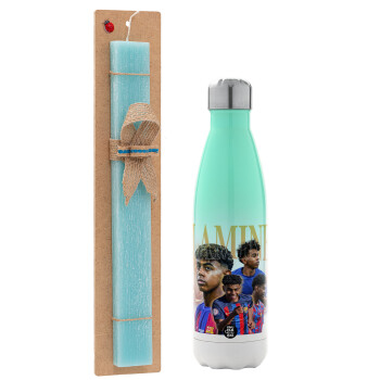 lamine yamal FCB, Easter Set, Metallic green/white thermos (Stainless steel), double-walled, 500ml & scented flat Easter candle (30cm) (TURQUOISE)