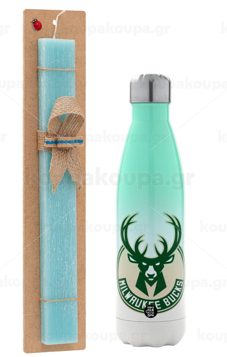 Milwaukee bucks, Easter Set, Metallic green/white thermos (Stainless steel), double-walled, 500ml & scented flat Easter candle (30cm) (TURQUOISE)