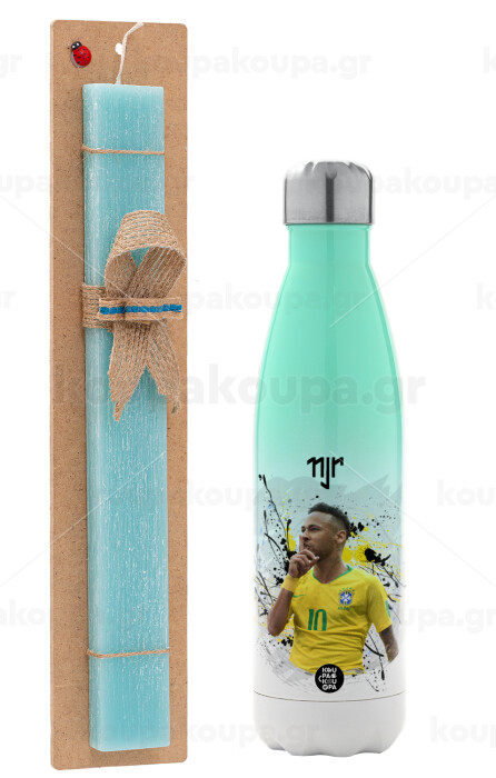 Neymar JR, Easter Set, Metallic green/white thermos (Stainless steel), double-walled, 500ml & scented flat Easter candle (30cm) (TURQUOISE)