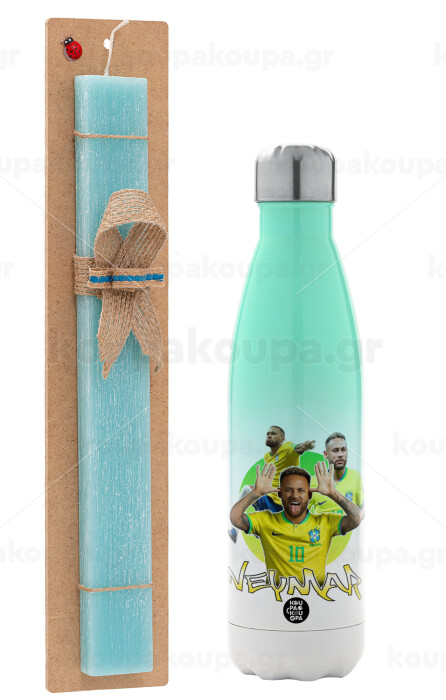 Neymar JR, Easter Set, Metallic green/white thermos (Stainless steel), double-walled, 500ml & scented flat Easter candle (30cm) (TURQUOISE)