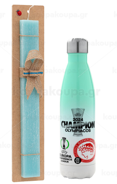Olympiacos UEFA Europa Conference League Champion 2024, Easter Set, Metallic green/white thermos (Stainless steel), double-walled, 500ml & scented flat Easter candle (30cm) (TURQUOISE)
