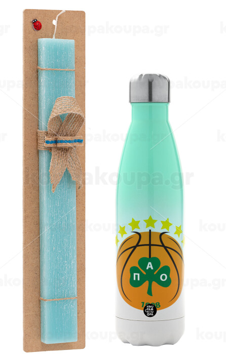 PAO BC, Easter Set, Metallic green/white thermos (Stainless steel), double-walled, 500ml & scented flat Easter candle (30cm) (TURQUOISE)