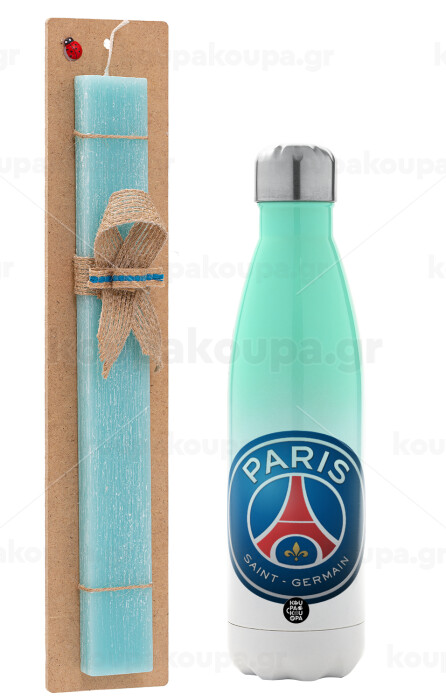 Paris Saint-Germain F.C., Easter Set, Metallic green/white thermos (Stainless steel), double-walled, 500ml & scented flat Easter candle (30cm) (TURQUOISE)
