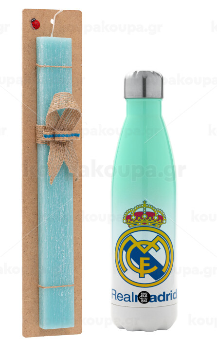 Real Madrid CF, Easter Set, Metallic green/white thermos (Stainless steel), double-walled, 500ml & scented flat Easter candle (30cm) (TURQUOISE)