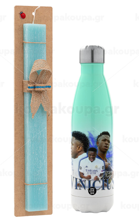 Vinicius Junior, Easter Set, Metallic green/white thermos (Stainless steel), double-walled, 500ml & scented flat Easter candle (30cm) (TURQUOISE)