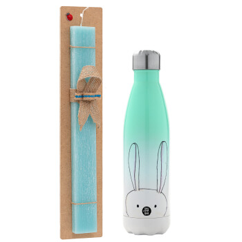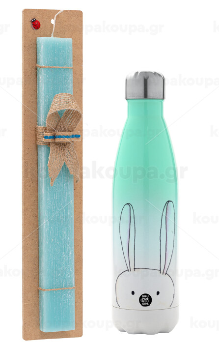 Ο λαγός του πάσχα, Easter Set, Metallic green/white thermos (Stainless steel), double-walled, 500ml & scented flat Easter candle (30cm) (TURQUOISE)