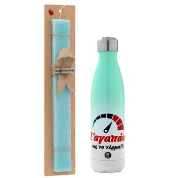 Σ΄ αγαπώ ως το τέρμα!!!, Easter Set, Metallic green/white thermos (Stainless steel), double-walled, 500ml & scented flat Easter candle (30cm) (TURQUOISE)