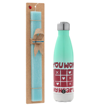 Τρίλιζα you won my heart, Easter Set, Metallic green/white thermos (Stainless steel), double-walled, 500ml & scented flat Easter candle (30cm) (TURQUOISE)