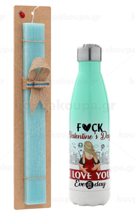 I love You Everyday , Easter Set, Metallic green/white thermos (Stainless steel), double-walled, 500ml & scented flat Easter candle (30cm) (TURQUOISE)