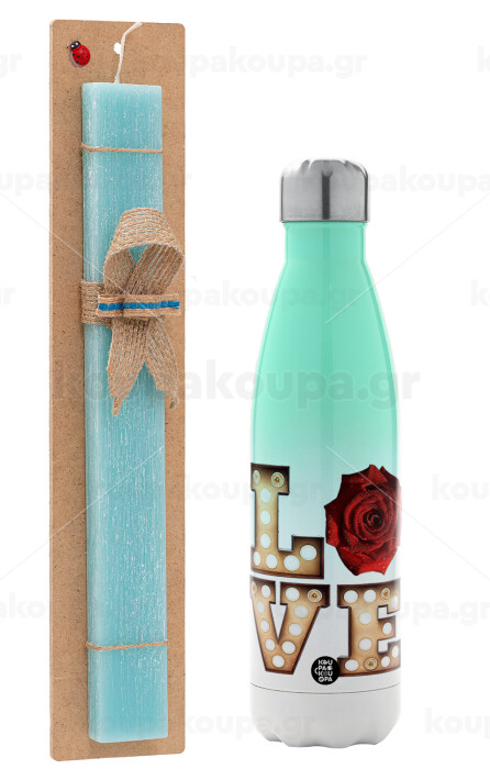 Love lights and roses, Easter Set, Metallic green/white thermos (Stainless steel), double-walled, 500ml & scented flat Easter candle (30cm) (TURQUOISE)