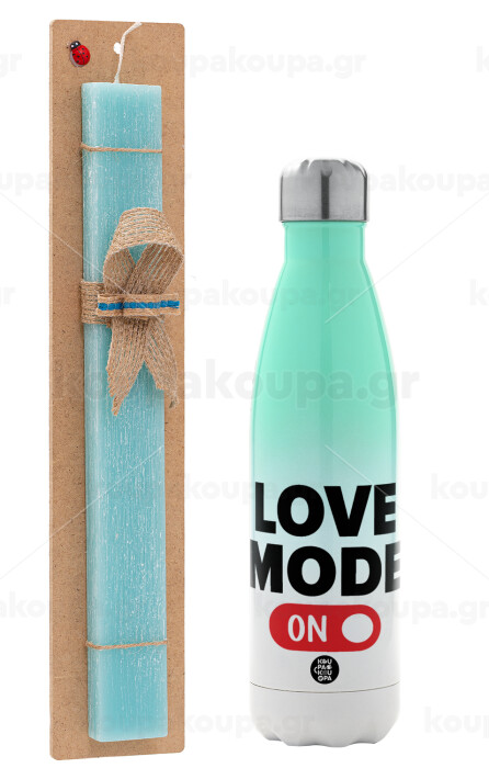 LOVE MODE ON, Easter Set, Metallic green/white thermos (Stainless steel), double-walled, 500ml & scented flat Easter candle (30cm) (TURQUOISE)