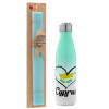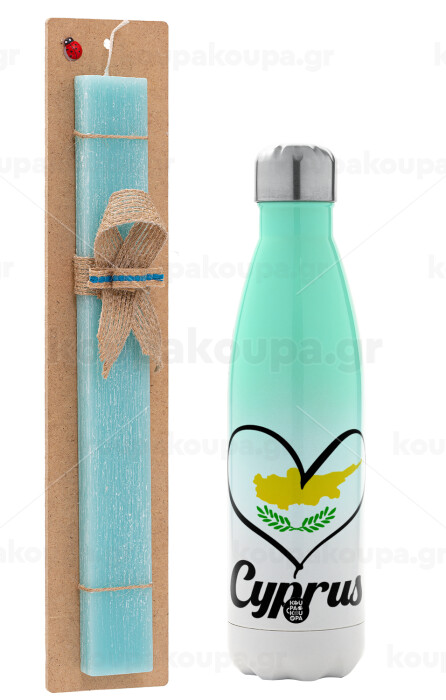 Cyprus flag, Easter Set, Metallic green/white thermos (Stainless steel), double-walled, 500ml & scented flat Easter candle (30cm) (TURQUOISE)