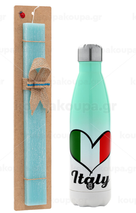 Italy flag, Easter Set, Metallic green/white thermos (Stainless steel), double-walled, 500ml & scented flat Easter candle (30cm) (TURQUOISE)