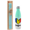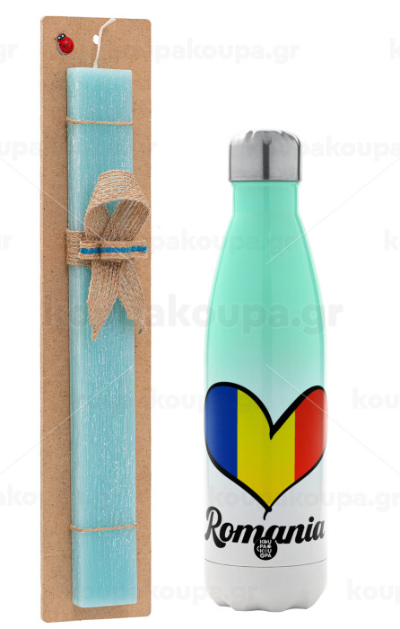 Romania flag, Easter Set, Metallic green/white thermos (Stainless steel), double-walled, 500ml & scented flat Easter candle (30cm) (TURQUOISE)