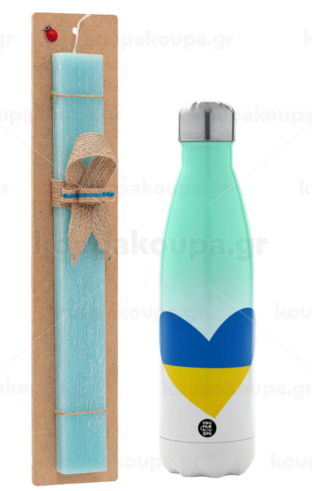 UKRAINE heart, Easter Set, Metallic green/white thermos (Stainless steel), double-walled, 500ml & scented flat Easter candle (30cm) (TURQUOISE)