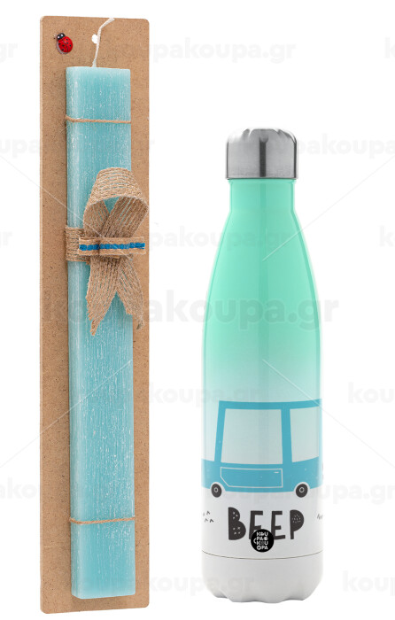 Car BEEP..., Easter Set, Metallic green/white thermos (Stainless steel), double-walled, 500ml & scented flat Easter candle (30cm) (TURQUOISE)