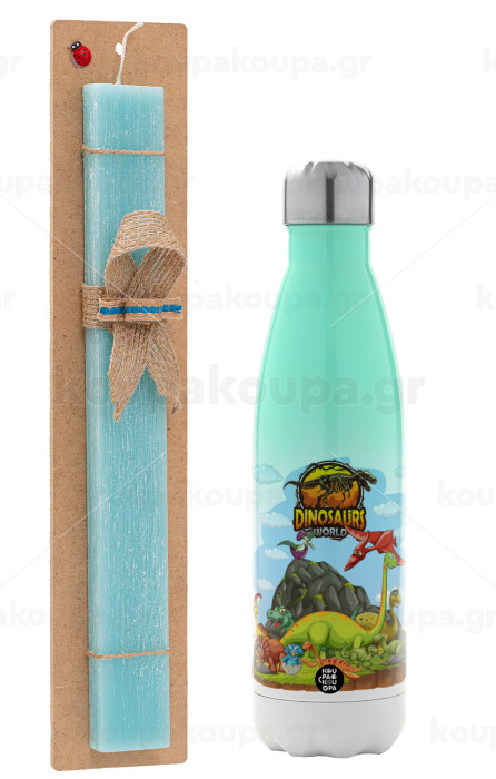 Dinosaur's world, Easter Set, Metallic green/white thermos (Stainless steel), double-walled, 500ml & scented flat Easter candle (30cm) (TURQUOISE)
