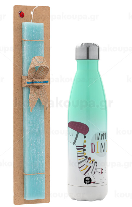 Happy Dino, Easter Set, Metallic green/white thermos (Stainless steel), double-walled, 500ml & scented flat Easter candle (30cm) (TURQUOISE)