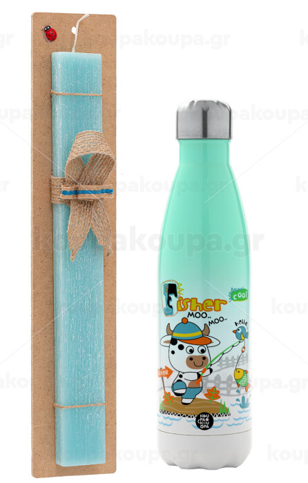 Kids Fisherman, Easter Set, Metallic green/white thermos (Stainless steel), double-walled, 500ml & scented flat Easter candle (30cm) (TURQUOISE)