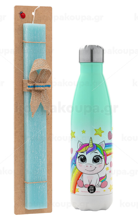 Unicorn baby με όνομα, Easter Set, Metallic green/white thermos (Stainless steel), double-walled, 500ml & scented flat Easter candle (30cm) (TURQUOISE)