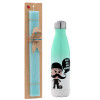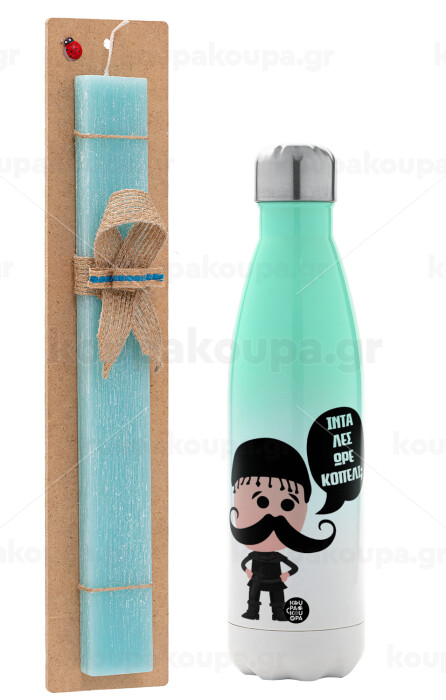 Κρητικός "Ίντα λες ωρέ κοπέλι", Easter Set, Metallic green/white thermos (Stainless steel), double-walled, 500ml & scented flat Easter candle (30cm) (TURQUOISE)