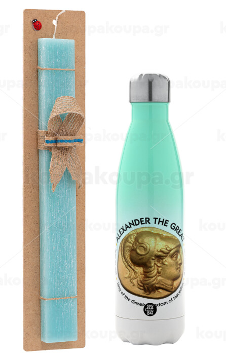Alexander the Great, Easter Set, Metallic green/white thermos (Stainless steel), double-walled, 500ml & scented flat Easter candle (30cm) (TURQUOISE)