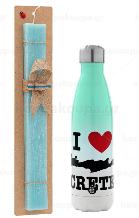 I Love Crete, Easter Set, Metallic green/white thermos (Stainless steel), double-walled, 500ml & scented flat Easter candle (30cm) (TURQUOISE)