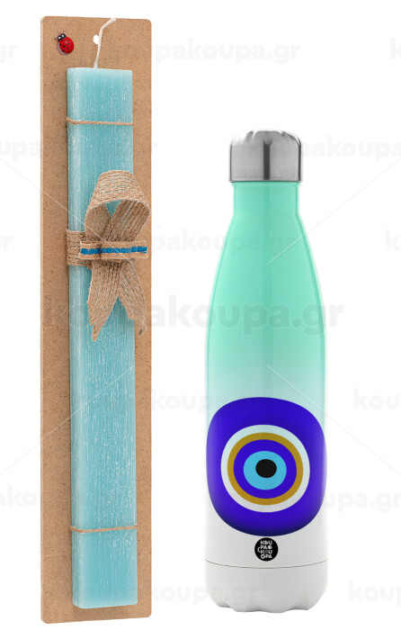 Το μάτι, Easter Set, Metallic green/white thermos (Stainless steel), double-walled, 500ml & scented flat Easter candle (30cm) (TURQUOISE)