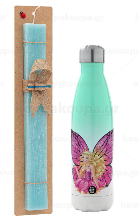 A fairy Barbie, Easter Set, Metallic green/white thermos (Stainless steel), double-walled, 500ml & scented flat Easter candle (30cm) (TURQUOISE)
