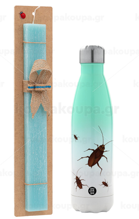 Blattodea, Easter Set, Metallic green/white thermos (Stainless steel), double-walled, 500ml & scented flat Easter candle (30cm) (TURQUOISE)