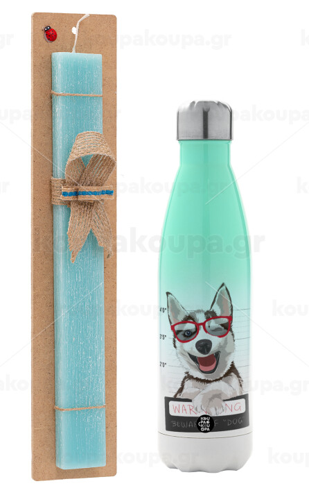 Warning, beware of Dog, Easter Set, Metallic green/white thermos (Stainless steel), double-walled, 500ml & scented flat Easter candle (30cm) (TURQUOISE)