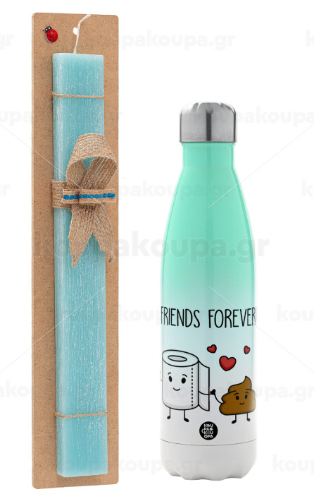 Friends forever, Easter Set, Metallic green/white thermos (Stainless steel), double-walled, 500ml & scented flat Easter candle (30cm) (TURQUOISE)