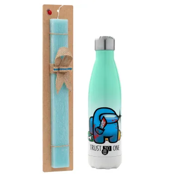 Among Trust no one, Easter Set, Metallic green/white thermos (Stainless steel), double-walled, 500ml & scented flat Easter candle (30cm) (TURQUOISE)
