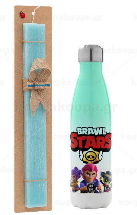 Brawl Stars Blue, Easter Set, Metallic green/white thermos (Stainless steel), double-walled, 500ml & scented flat Easter candle (30cm) (TURQUOISE)
