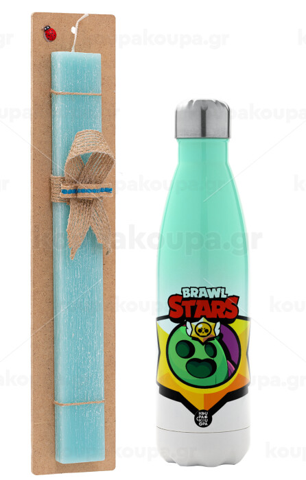 Brawl Stars Spike, Easter Set, Metallic green/white thermos (Stainless steel), double-walled, 500ml & scented flat Easter candle (30cm) (TURQUOISE)