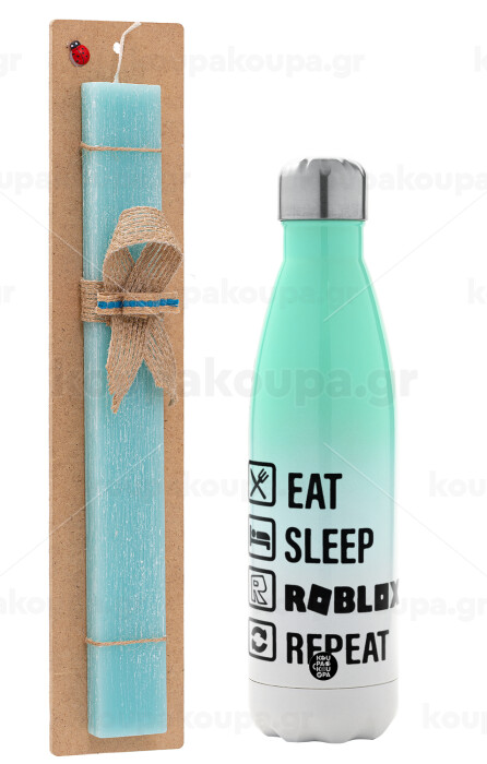 Eat, Sleep, Roblox, Repeat, Easter Set, Metallic green/white thermos (Stainless steel), double-walled, 500ml & scented flat Easter candle (30cm) (TURQUOISE)